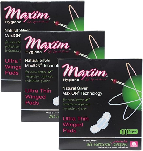 Maxim MaxION Cotton Pads Super Absorbancy, 30ct, 100% Cotton, Winged Menstrual Pads for Women, Organic Cotton Pads, Eco Friendly, 3 Packs ...