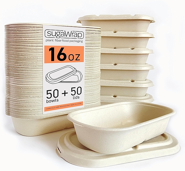 SugaWrap Disposable 16oz Oval Food Containers with Lids [50 Bowls + 50 Lids] Eco-Friendly Biodegradable Bamboo & Sugarcane, Sturdy &am...