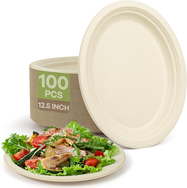 FEHHTO Disposable Oval Paper Plates, 100Pack 12.5inch Biodegradable Paper Plates, Compostable Heavy Duty Bagasse Platters Eco-Friendly Sug...