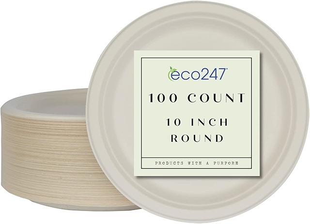 eco247 100% Compostable Round Plates [10" - 100 Count] Heavy Duty Bulk Disposable Plates | Eco-Friendly White Recyclable Plates | Biod...