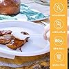 FEATURES: Our eco-friendly paper plates are microwavable, thick, and strong, with no plastic or wax lining, unbleached, dye-free, gluten-free, plastic-free, BPA-free, cut-resistant, and oil-resistant. Perfect for serving hot or cold food. Microwave safe up to 248° F (with food). *Caution: Hot and moist foods may cause condensation to form at the bottom of plates. When serving hot food on a wooden table, a trivet is recommended.