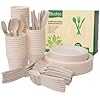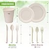 ???? 【Plant-Based Material】- Made from sugarcane bagasse fiber (plates,cups) and cornstarch (forks, knives & spoons). No wax lining and non-toxic. NO TREE is cut down to create this sturdy and disposable plates and utensils. A great alternative to plastic or wood plates set.